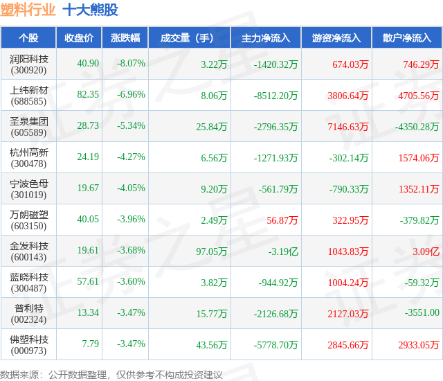个股表现方面,塑料行业当日领跌股为润阳科技(300920),该股当日报收40.9,下跌8.07%,成交量3.22万,主力资金净流出1420.32万元。上纬新材(688585)以下跌6.96%紧随其后,该股当日成交量8.06万,主力资金净流出8512.2万元。除此之外,圣泉集团(605589)、杭州高新(300478)、宁波色母(301019)均进入当日熊股之列。具体个股列表见下表: