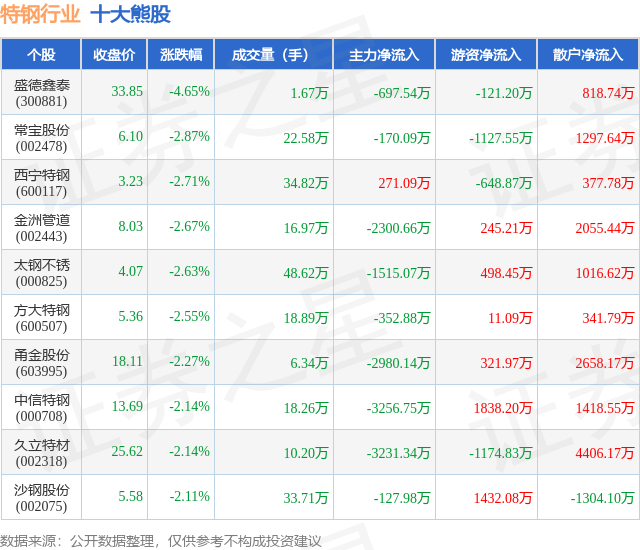 个股表现方面,特钢行业当日领跌股为盛德鑫泰(300881),该股当日报收33.85,下跌4.65%,成交量1.67万,主力资金净流出697.54万元。常宝股份(002478)以下跌2.87%紧随其后,该股当日成交量22.58万,主力资金净流出170.09万元。除此之外,西宁特钢(600117)、金洲管道(002443)、太钢不锈(000825)均进入当日熊股之列。具体个股列表见下表: