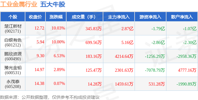 个股表现方面,工业金属行业当日领涨股为楚江新材(002171),该股当日报收12.72,上涨10.03%,成交量345.83万,主力资金净流入2.87亿元。白银有色(601212)以上涨10.0%紧随其后,该股当日成交量699.56万,主力资金净流入5.16亿元。除此之外,鹏欣资源(600490)、豫光金铅(600531)、永茂泰(605208)均进入当日牛股之列。具体个股列表见下表: