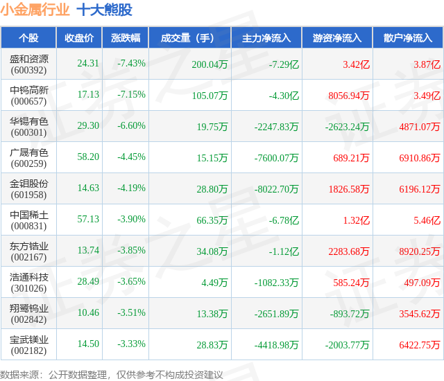 个股表现方面,小金属行业当日领跌股为盛和资源(600392),该股当日报收24.31,下跌7.43%,成交量200.04万,主力资金净流出7.29亿元。中钨高新(000657)以下跌7.15%紧随其后,该股当日成交量105.07万,主力资金净流出4.3亿元。除此之外,华锡有色(600301)、广晟有色(600259)、金钼股份(601958)均进入当日熊股之列。具体个股列表见下表: