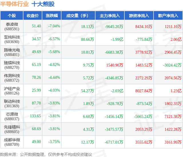 个股表现方面,半导体行业当日领跌股为泰凌微(688591),该股当日报收51.4,下跌7.04%,成交量18.13万,主力资金净流出9645.2万元。至纯科技(603690)以下跌6.57%紧随其后,该股当日成交量80.66万,主力资金净流出1.99亿元。除此之外,路维光电(688401)、臻镭科技(688270)、伟测科技(688372)均进入当日熊股之列。具体个股列表见下表: