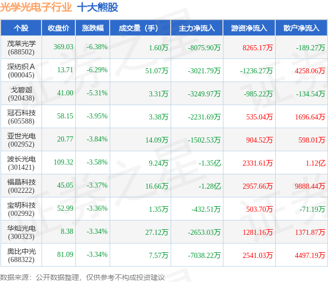 个股表现方面,光学光电子行业当日领跌股为茂莱光学(688502),该股当日报收369.03,下跌6.38%,成交量1.6万,主力资金净流出8075.9万元。深纺织A(000045)以下跌6.29%紧随其后,该股当日成交量51.07万,主力资金净流出3021.79万元。除此之外,戈碧迦(920438)、冠石科技(605588)、亚世光电(002952)均进入当日熊股之列。具体个股列表见下表: