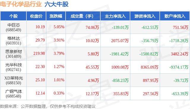 个股表现方面,电子化学品行业当日领涨股为中巨芯(688549),该股当日报收10.19,上涨5.05%,成交量74.06万,主力资金净流出139.01万元。格林达(603931)以上涨3.91%紧随其后,该股当日成交量10.02万,主力资金净流入2075.07万元。除此之外,思泉新材(301489)、光华科技(002741)、XD莱特光(688150)均进入当日牛股之列。具体个股列表见下表: