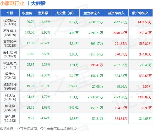 个股表现方面,小家电行业当日领跌股为比依股份(603215),该股当日报收20.7,下跌4.43%,成交量8.22万,主力资金净流出831.77万元。石头科技(688169)以下跌2.92%紧随其后,该股当日成交量4.09万,主力资金净流出7296.21万元。除此之外,富佳股份(603219)、彩虹集团(003023)、欧圣电气(301187)均进入当日熊股之列。具体个股列表见下表: