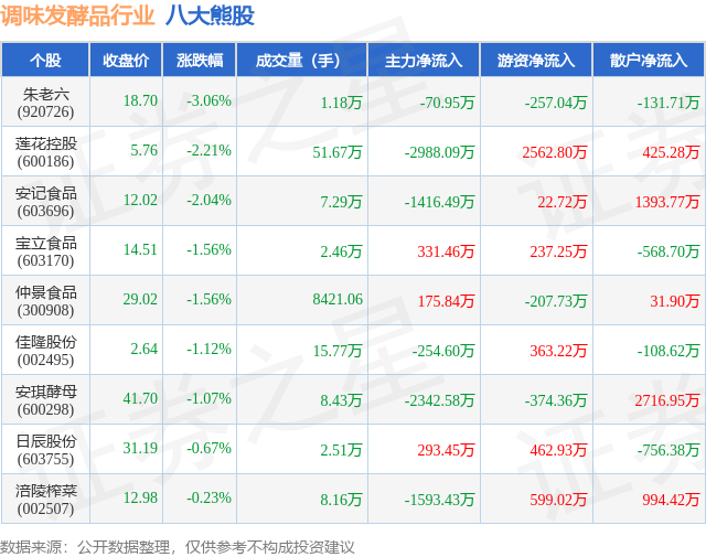 个股表现方面,调味发酵品行业当日领跌股为朱老六(920726),该股当日报收18.7,下跌3.06%,成交量1.18万,主力资金净流出70.95万元。莲花控股(600186)以下跌2.21%紧随其后,该股当日成交量51.67万,主力资金净流出2988.09万元。除此之外,安记食品(603696)、宝立食品(603170)、仲景食品(300908)均进入当日熊股之列。具体个股列表见下表: