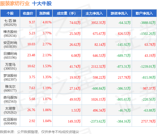 个股表现方面,服装家纺行业当日领涨股为七 匹 狼(002029),该股当日报收9.37,上涨4.81%,成交量74.02万,主力资金净流入3952.35万元。棒杰股份(002634)以上涨3.77%紧随其后,该股当日成交量25.5万,主力资金净流入675.67万元。除此之外,安正时尚(603839)、日播时尚(603196)、万里马(300591)均进入当日牛股之列。具体个股列表见下表: