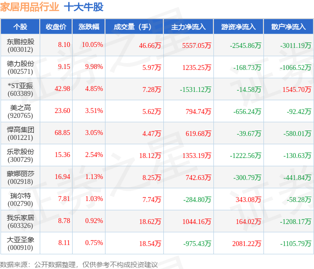个股表现方面,家居用品行业当日领涨股为东鹏控股(003012),该股当日报收8.1,上涨10.05%,成交量46.66万,主力资金净流入5557.05万元。德力股份(002571)以上涨9.98%紧随其后,该股当日成交量5.97万,主力资金净流入1235.25万元。除此之外,*ST亚振(603389)、美之高(920765)、悍高集团(001221)均进入当日牛股之列。具体个股列表见下表: