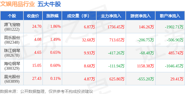 个股表现方面,文娱用品行业当日领涨股为源飞宠物(001222),该股当日报收24.7,上涨1.86%,成交量6.87万,主力资金净流入1756.45万元。高乐股份(002348)以上涨1.49%紧随其后,该股当日成交量32.68万,主力资金净流入713.65万元。除此之外,珠江钢琴(002678)、海伦钢琴(300329)、晨光股份(603899)均进入当日牛股之列。具体个股列表见下表: