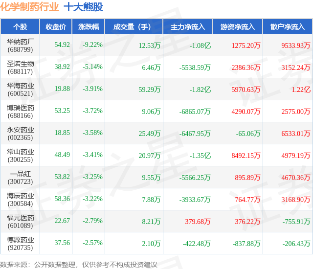 个股表现方面,化学制药行业当日领跌股为华纳药厂(688799),该股当日报收54.92,下跌9.22%,成交量12.53万,主力资金净流出1.08亿元。圣诺生物(688117)以下跌5.14%紧随其后,该股当日成交量6.46万,主力资金净流出5538.59万元。除此之外,华海药业(600521)、博瑞医药(688166)、永安药业(002365)均进入当日熊股之列。具体个股列表见下表: