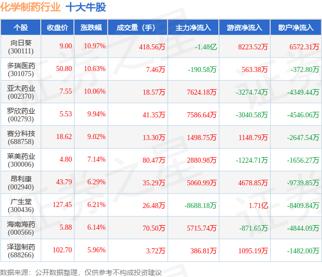 个股表现方面,化学制药行业当日领涨股为向日葵(300111),该股当日报收9.0,上涨10.97%,成交量418.56万,主力资金净流出1.48亿元。多瑞医药(301075)以上涨10.63%紧随其后,该股当日成交量7.46万,主力资金净流出190.58万元。除此之外,亚太药业(002370)、罗欣药业(002793)、赛分科技(688758)均进入当日牛股之列。具体个股列表见下表: