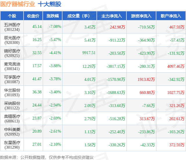 个股表现方面,医疗器械行业当日领跌股为五洲医疗(301234),该股当日报收45.14,下跌7.08%,成交量3.45万,主力资金净流入242.98万元。辰光医疗(920300)以下跌5.47%紧随其后,该股当日成交量5.41万,主力资金净流出911.22万元。除此之外,锦好医疗(920925)、麦克奥迪(300341)、可孚医疗(301087)均进入当日熊股之列。具体个股列表见下表: