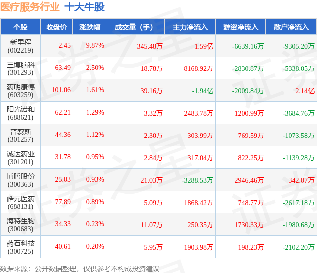 个股表现方面,医疗服务行业当日领涨股为新里程(002219),该股当日报收2.45,上涨9.87%,成交量345.48万,主力资金净流入1.59亿元。三博脑科(301293)以上涨2.5%紧随其后,该股当日成交量18.78万,主力资金净流入8168.92万元。除此之外,药明康德(603259)、阳光诺和(688621)、普蕊斯(301257)均进入当日牛股之列。具体个股列表见下表:
