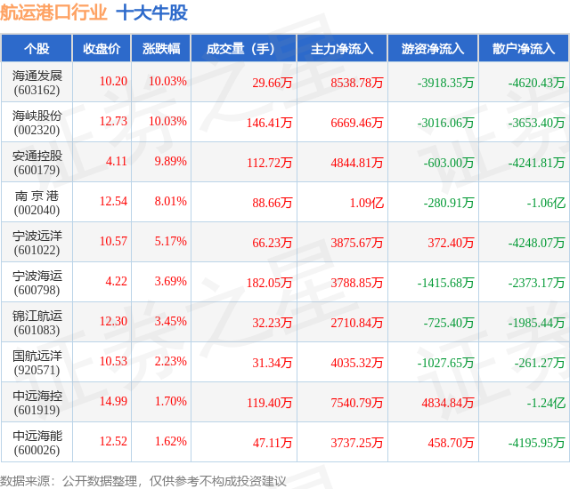 个股表现方面,航运港口行业当日领涨股为海通发展(603162),该股当日报收10.2,上涨10.03%,成交量29.66万,主力资金净流入8538.78万元。海峡股份(002320)以上涨10.03%紧随其后,该股当日成交量146.41万,主力资金净流入6669.46万元。除此之外,安通控股(600179)、南 京 港(002040)、宁波远洋(601022)均进入当日牛股之列。具体个股列表见下表: