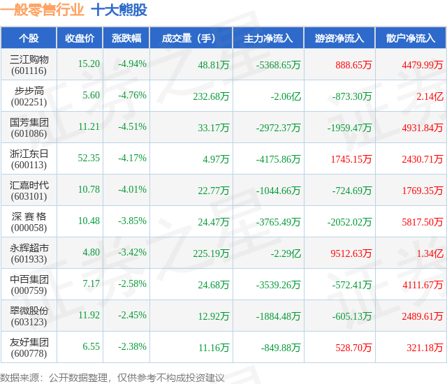 个股表现方面,一般零售行业当日领跌股为三江购物(601116),该股当日报收15.2,下跌4.94%,成交量48.81万,主力资金净流出5368.65万元。步步高(002251)以下跌4.76%紧随其后,该股当日成交量232.68万,主力资金净流出2.06亿元。除此之外,国芳集团(601086)、浙江东日(600113)、汇嘉时代(603101)均进入当日熊股之列。具体个股列表见下表: