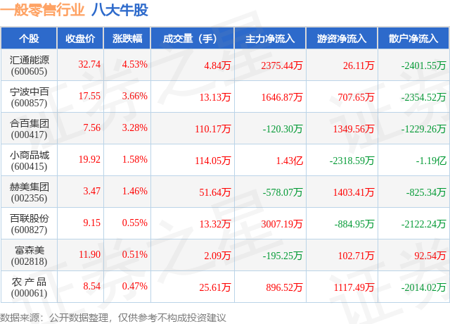 个股表现方面,一般零售行业当日领涨股为汇通能源(600605),该股当日报收32.74,上涨4.53%,成交量4.84万,主力资金净流入2375.44万元。宁波中百(600857)以上涨3.66%紧随其后,该股当日成交量13.13万,主力资金净流入1646.87万元。除此之外,合百集团(000417)、小商品城(600415)、赫美集团(002356)均进入当日牛股之列。具体个股列表见下表: