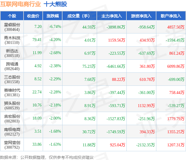 个股表现方面,互联网电商行业当日领跌股为星徽股份(300464),该股当日报收7.2,下跌6.74%,成交量44.59万,主力资金净流出3898.86万元。青木科技(301110)以下跌4.2%紧随其后,该股当日成交量4.01万,主力资金净流入1159.56万元。除此之外,新迅达(300518)、跨境通(002640)、三态股份(301558)均进入当日熊股之列。具体个股列表见下表: