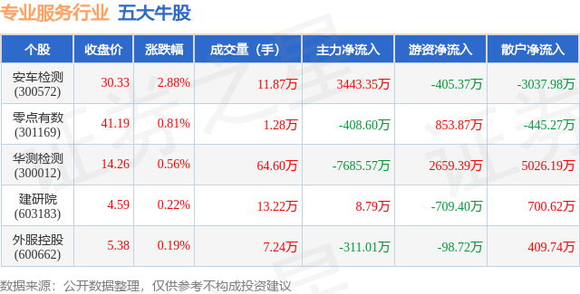 个股表现方面,专业服务行业当日领涨股为安车检测(300572),该股当日报收30.33,上涨2.88%,成交量11.87万,主力资金净流入3443.35万元。零点有数(301169)以上涨0.81%紧随其后,该股当日成交量1.28万,主力资金净流出408.6万元。除此之外,华测检测(300012)、建研院(603183)、外服控股(600662)均进入当日牛股之列。具体个股列表见下表: