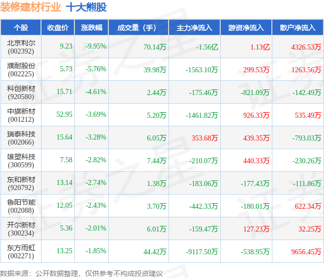 个股表现方面,装修建材行业当日领跌股为北京利尔(002392),该股当日报收9.23,下跌9.95%,成交量70.14万,主力资金净流出1.56亿元。濮耐股份(002225)以下跌5.76%紧随其后,该股当日成交量39.98万,主力资金净流出1563.1万元。除此之外,科创新材(920580)、中旗新材(001212)、瑞泰科技(002066)均进入当日熊股之列。具体个股列表见下表: