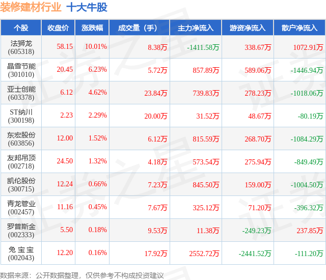 个股表现方面,装修建材行业当日领涨股为法狮龙(605318),该股当日报收58.15,上涨10.01%,成交量8.38万,主力资金净流出1411.58万元。晶雪节能(301010)以上涨6.23%紧随其后,该股当日成交量5.72万,主力资金净流入857.89万元。除此之外,亚士创能(603378)、ST纳川(300198)、东宏股份(603856)均进入当日牛股之列。具体个股列表见下表: