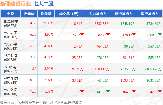 个股表现方面,基础建设行业当日领涨股为国晟科技(603778),该股当日报收4.33,上涨9.9%,成交量16.61万,主力资金净流入3332.58万元。*ST花王(603007)以上涨4.98%紧随其后,该股当日成交量25.53万,主力资金净流入82.72万元。除此之外,*ST正平(603843)、*ST围海(002586)、ST岭南(002717)均进入当日牛股之列。具体个股列表见下表: