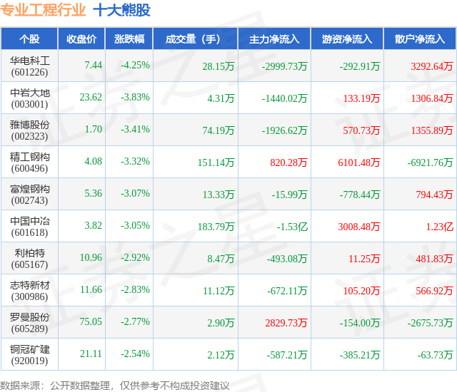 个股表现方面,专业工程行业当日领跌股为华电科工(601226),该股当日报收7.44,下跌4.25%,成交量28.15万,主力资金净流出2999.73万元。中岩大地(003001)以下跌3.83%紧随其后,该股当日成交量4.31万,主力资金净流出1440.02万元。除此之外,雅博股份(002323)、精工钢构(600496)、富煌钢构(002743)均进入当日熊股之列。具体个股列表见下表: