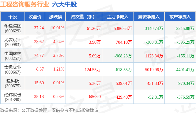 个股表现方面,工程咨询服务行业当日领涨股为华建集团(600629),该股当日报收37.24,上涨10.01%,成交量61.26万,主力资金净流入5386.63万元。尤安设计(300983)以上涨4.24%紧随其后,该股当日成交量3.9万,主力资金净流入704.1万元。除此之外,中国瑞林(603257)、太极实业(600667)、建科院(300675)均进入当日牛股之列。具体个股列表见下表: