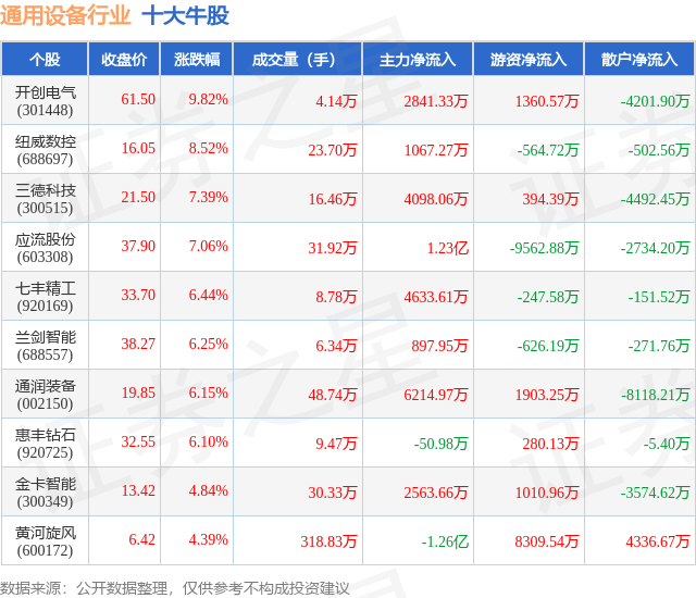 个股表现方面,通用设备行业当日领涨股为开创电气(301448),该股当日报收61.5,上涨9.82%,成交量4.14万,主力资金净流入2841.33万元。纽威数控(688697)以上涨8.52%紧随其后,该股当日成交量23.7万,主力资金净流入1067.27万元。除此之外,三德科技(300515)、应流股份(603308)、七丰精工(920169)均进入当日牛股之列。具体个股列表见下表:
