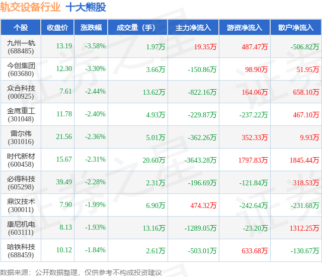 个股表现方面,轨交设备行业当日领跌股为九州一轨(688485),该股当日报收13.19,下跌3.58%,成交量1.97万,主力资金净流入19.35万元。今创集团(603680)以下跌3.3%紧随其后,该股当日成交量3.66万,主力资金净流出150.86万元。除此之外,众合科技(000925)、金鹰重工(301048)、雷尔伟(301016)均进入当日熊股之列。具体个股列表见下表:
