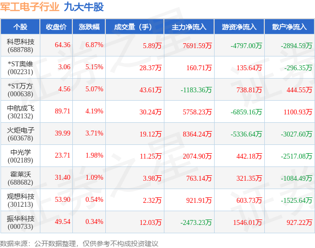 个股表现方面,军工电子行业当日领涨股为科思科技(688788),该股当日报收64.36,上涨6.87%,成交量5.89万,主力资金净流入7691.59万元。*ST奥维(002231)以上涨5.15%紧随其后,该股当日成交量28.37万,主力资金净流入160.71万元。除此之外,*ST万方(000638)、中航成飞(302132)、火炬电子(603678)均进入当日牛股之列。具体个股列表见下表: