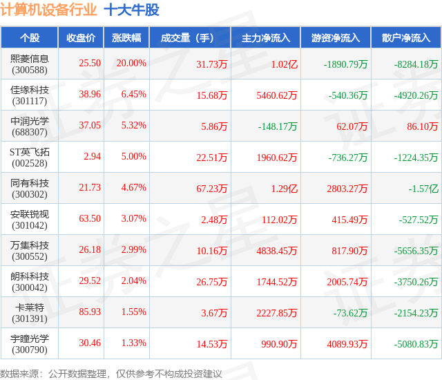 个股表现方面,计算机设备行业当日领涨股为熙菱信息(300588),该股当日报收25.5,上涨20.0%,成交量31.73万,主力资金净流入1.02亿元。佳缘科技(301117)以上涨6.45%紧随其后,该股当日成交量15.68万,主力资金净流入5460.62万元。除此之外,中润光学(688307)、ST英飞拓(002528)、同有科技(300302)均进入当日牛股之列。具体个股列表见下表: