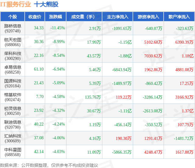 个股表现方面,IT服务行业当日领跌股为路桥信息(920748),该股当日报收34.33,下跌11.45%,成交量2.91万,主力资金净流出1091.65万元。航天宏图(688066)以下跌8.99%紧随其后,该股当日成交量17.99万,主力资金净流出1.15亿元。除此之外,荣科科技(300290)、卓易信息(688258)、国源科技(920184)均进入当日熊股之列。具体个股列表见下表: