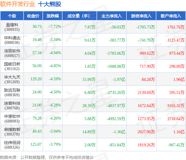 个股表现方面,软件开发行业当日领跌股为盈建科(300935),该股当日报收30.73,下跌7.72%,成交量7.87万,主力资金净流出56.03万元。中科通达(688038)以下跌5.34%紧随其后,该股当日成交量9.61万,主力资金净流出383.77万元。除此之外,浩辰软件(688657)、国能日新(301162)、华大九天(301269)均进入当日熊股之列。具体个股列表见下表: