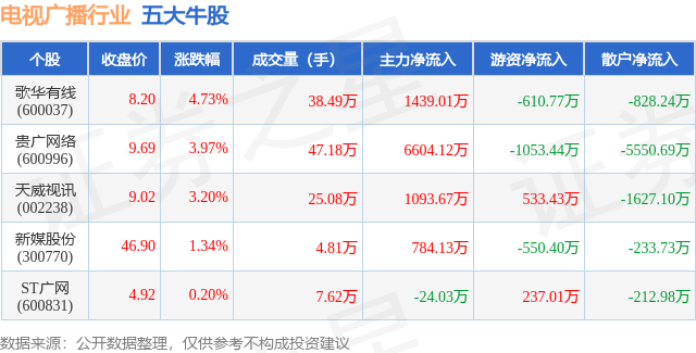 个股表现方面,电视广播行业当日领涨股为歌华有线(600037),该股当日报收8.2,上涨4.73%,成交量38.49万,主力资金净流入1439.01万元。贵广网络(600996)以上涨3.97%紧随其后,该股当日成交量47.18万,主力资金净流入6604.12万元。除此之外,天威视讯(002238)、新媒股份(300770)、ST广网(600831)均进入当日牛股之列。具体个股列表见下表: