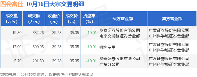 证券之星消息,10月16日四会富仕发生大宗交易,交易数据如下: