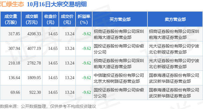 证券之星消息,10月16日汇绿生态发生大宗交易,交易数据如下: