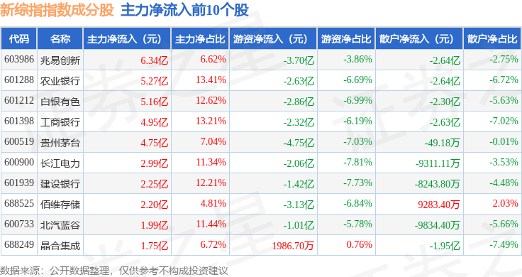 资金流向方面,新综指(000017)指数成份股当日主力资金净流出合计327.52亿元,游资资金净流入合计93.28亿元,散户资金净流入合计234.24亿元。成份股资金流向详情见下表: