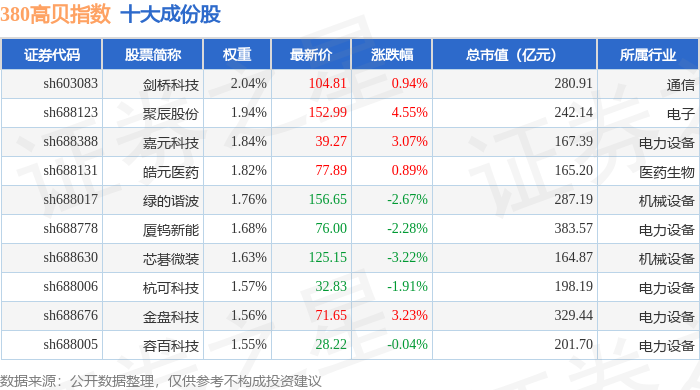 证券之星消息,10月16日,380高贝(000137)指数报收于5926.37点,跌1.22%,成交655.97亿元,换手率2.82%。当日该指数成份股中,上涨的有19家,聚辰股份以4.55%的涨幅领涨,下跌的有80家,至纯科技以6.57%的跌幅领跌。
