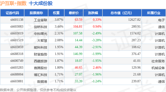 证券之星消息,10月16日,沪互联+(000162)指数报收于3630.86点,跌0.93%,成交492.46亿元,换手率1.1%。当日该指数成份股中,上涨的有16家,中国高科以4.82%的涨幅领涨,下跌的有55家,禾川科技以4.12%的跌幅领跌。