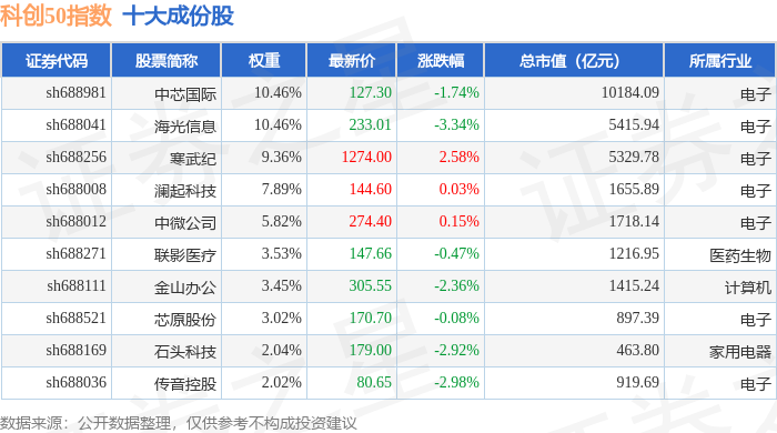 证券之星消息,10月16日,科创50(000688)指数报收于1416.58点,跌0.94%,成交741.72亿元,换手率1.66%。当日该指数成份股中,上涨的有10家,佰维存储以8.76%的涨幅领涨,下跌的有40家,沪硅产业以4.03%的跌幅领跌。