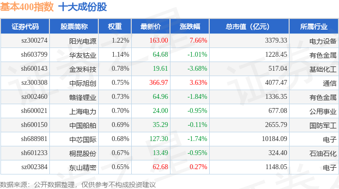基本400(000966)指数十大成份股详情如下: