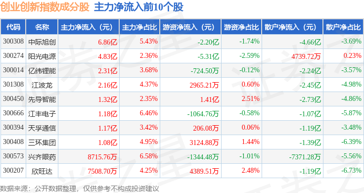 资金流向方面,创业创新(399018)指数成份股当日主力资金净流出合计21.05亿元,游资资金净流入合计15.01亿元,散户资金净流入合计6.04亿元。成份股资金流向详情见下表: