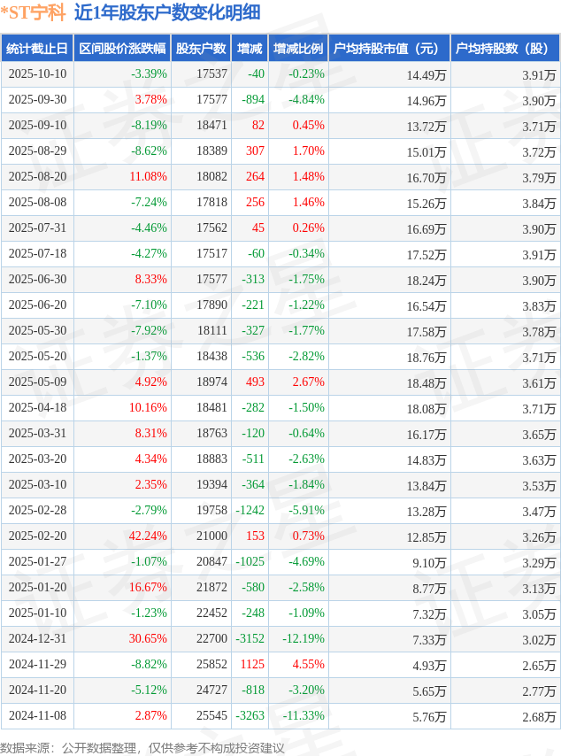 从股价来看,2025年9月30日至2025年10月10日,*ST宁科区间跌幅为3.39%,在此期间股东户数减少40.0户,减幅为0.23%。