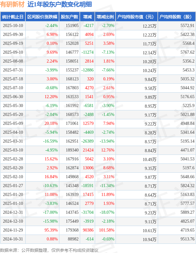 从股价来看,2025年9月19日至2025年10月10日,有研新材区间涨幅为4.37%,在此期间股东户数减少123.0户,减幅为0.08%。