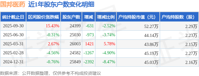 从股价来看,2025年6月30日至2025年9月30日,国邦医药区间涨幅为15.43%,在此期间股东户数减少631.0户,减幅为2.52%。