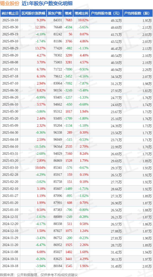 从股价来看,2025年9月30日至2025年10月10日,锡业股份区间涨幅为9.2%,在此期间股东户数增加7683.0户,增幅为10.02%。