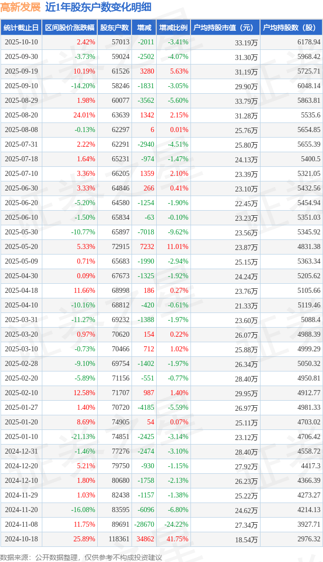 从股价来看,2025年9月30日至2025年10月10日,高新发展区间涨幅为2.42%,在此期间股东户数减少2011.0户,减幅为3.41%。