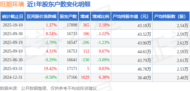 从股价来看,2025年9月30日至2025年10月10日,旺能环境区间涨幅为1.37%,在此期间股东户数增加365.0户,增幅为2.18%。