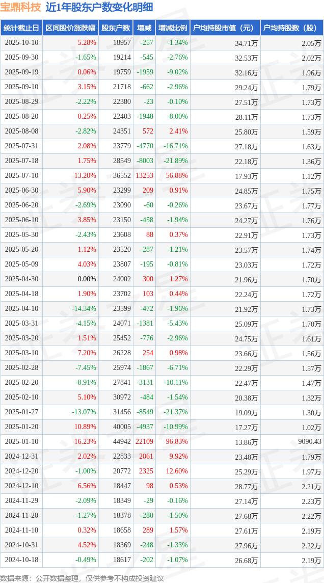 证券之星消息,近日宝鼎科技披露,截至2025年10月10日公司股东户数为1.9万户,较9月30日减少257.0户,减幅为1.34%。户均持股数量由上期的2.02万股增加至2.05万股,户均持股市值为34.71万元。