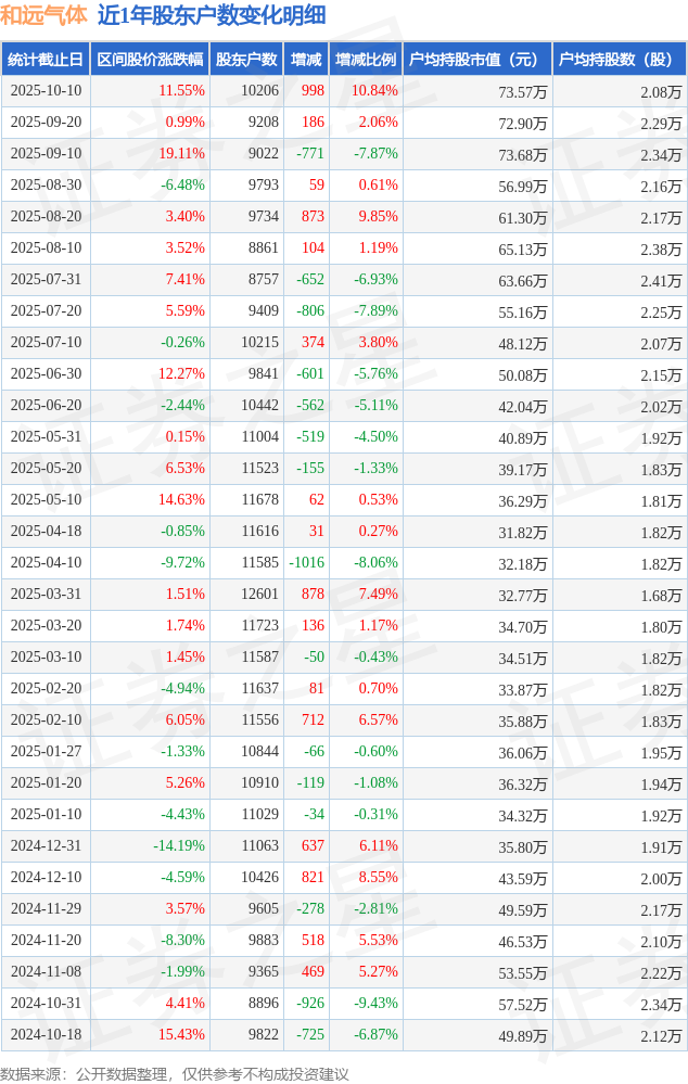 从股价来看,2025年9月20日至2025年10月10日,和远气体区间涨幅为11.55%,在此期间股东户数增加998.0户,增幅为10.84%。