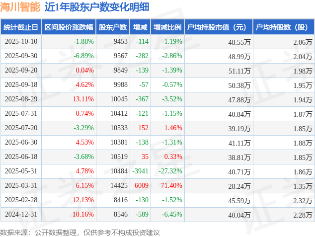 从股价来看,2025年10月9日至2025年10月10日,海川智能区间跌幅为1.88%,在此期间股东户数减少114.0户,减幅为1.19%。